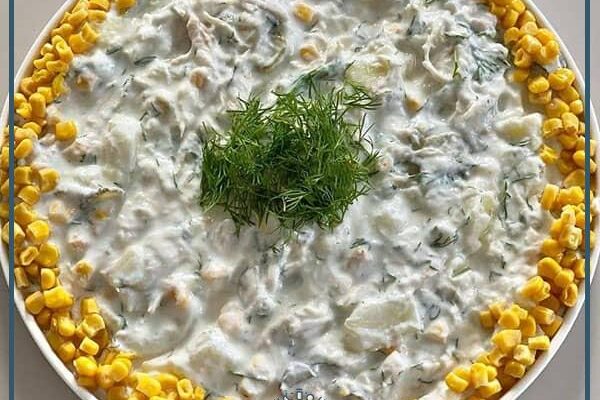 پس از آن، خیارشور و شوید را شسته و ریز خرد می کنیم. سینه مرغ و سیب زمینی پخته شده را خرد کرده و با خیارشور، شوید، ذرت و ماست سیر مخلوط می کنیم. در نهایت سس را به مخلوط اضافه کرده و به مدت یک ساعت در یخچال قرار می دهیم تا طعم ها ترکیب شوند.