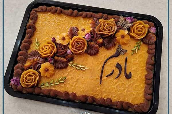 در نهایت، حلوا را روی سینی مناسب پخش کرده و با پودر نارگیل، خلال پسته و بادام تزیین می کنیم. همچنین می توان مقداری از حلوا را درون ماسوره ریخته و روی آن را با شکوفه تزیین نمود.