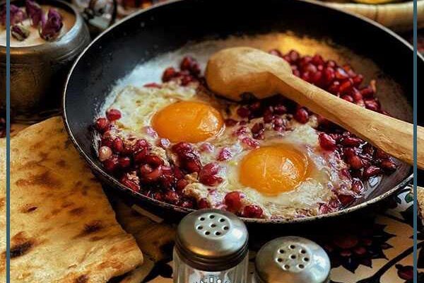 وقتی انار ها پخته و نرم شد، تخم مرغ را داخل تابه می شکنیم و اجازه می دهیم تا خودش را بگیرد. سپس آن را از روی حرارت برداشته و در ظرف مناسب سرو می کنیم. این غذا را می توان در کنار نان یا کته سرو نمود