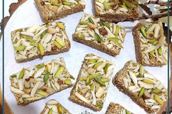 در ادامه، مخلوط را در یک قالب مناسب ریخته و با ارده چرب می کنیم. پس از فشردن مخلوط، عسل را بخار کرده و به صورت یکنواخت روی سمسمیه می مالیم. سپس خلال پسته و بادام را روی آن می پوشانیم.
